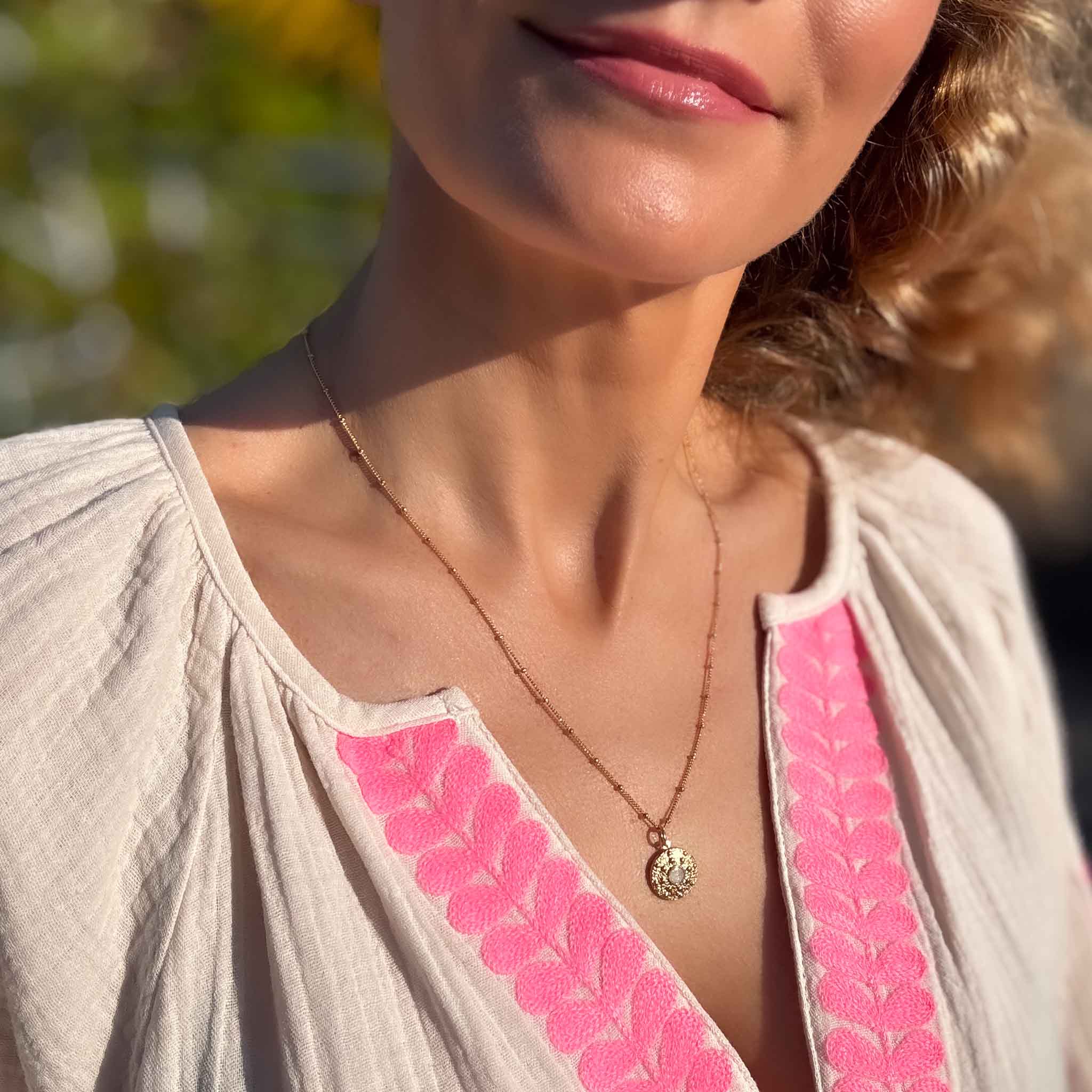 Portée sur la chaîne dorée à grain Sainte Thérèse sur moi (chemisier beige et rose)