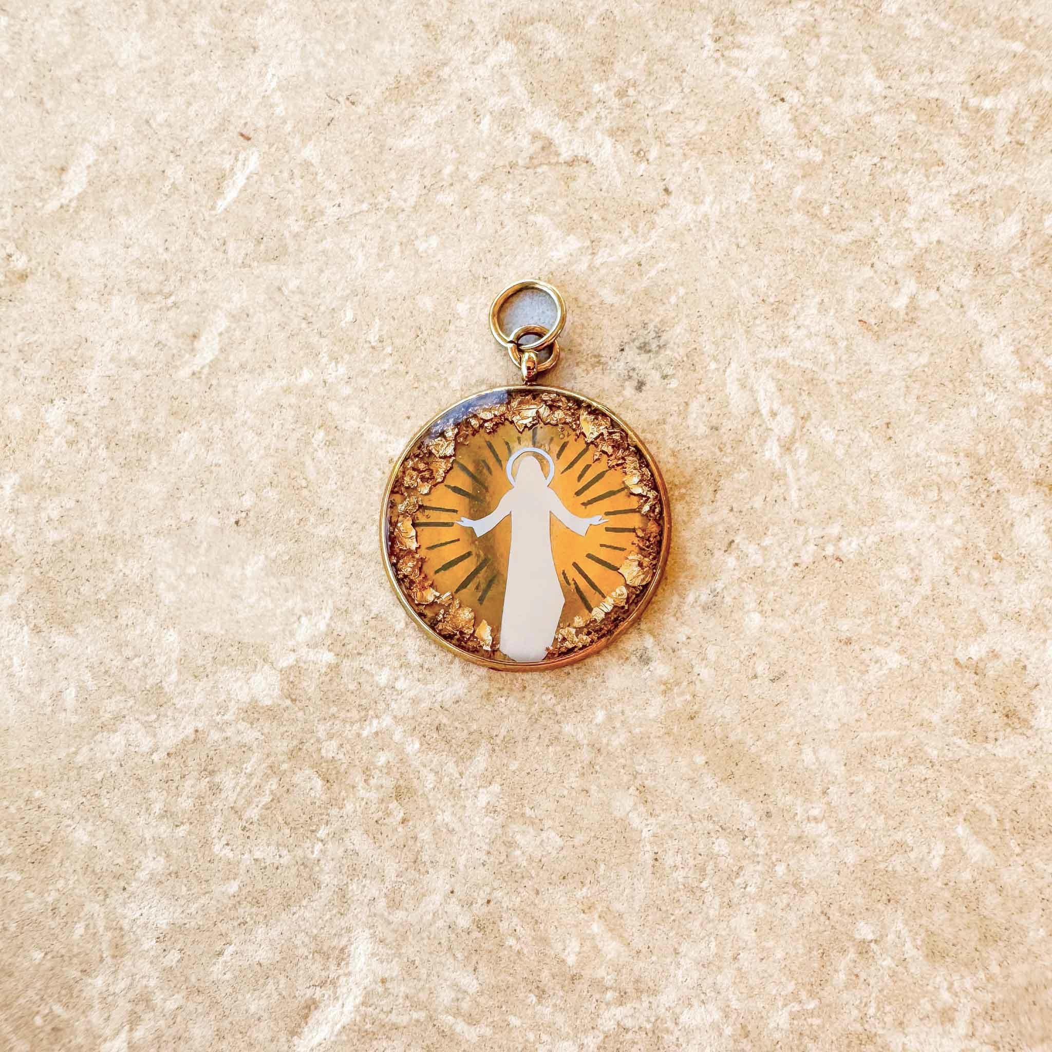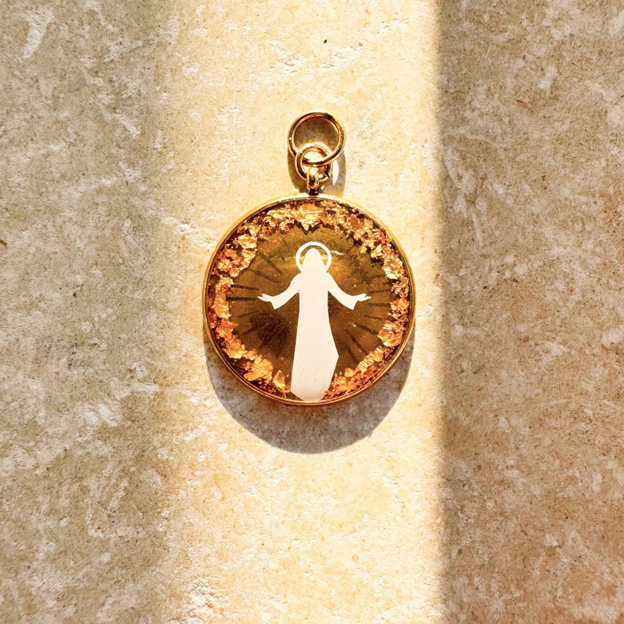 Deux mots, et une immense clarté. Celle du Ressuscité, lumineux de gloire. Celle de l’âme de Marie-Madeleine qui comprend que l’Amour devant elle vient de triompher pour toujours. La lourde pierre du tombeau et de la mort n’est plus… elle s’est transformée dans cette médaille en un halo d’or qui entoure la silhouette lumineuse de celui qui a tenu sa promesse : « Je ne vous laisserai pas orphelins ; je reviendrai vers vous. »